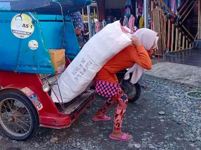 Nur Dahliah yang akrab disapa ‘Cinthia Clara’ oleh rekan komunitas Kerabat Belawa ini pun rela memikul karung berisi bantuan bahan makanan dan pakaian yang dikumpul dari sejumlah donatur.