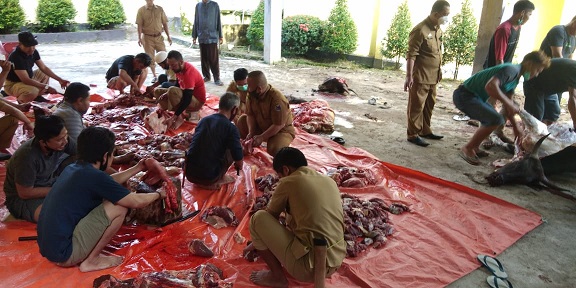 Selama proses penyembelihan dan pembagian daging kurban, para pekerja dan pegawai tersebut tetap mematuhi protokol kesahatan yang ditetapkan.(dwd)
