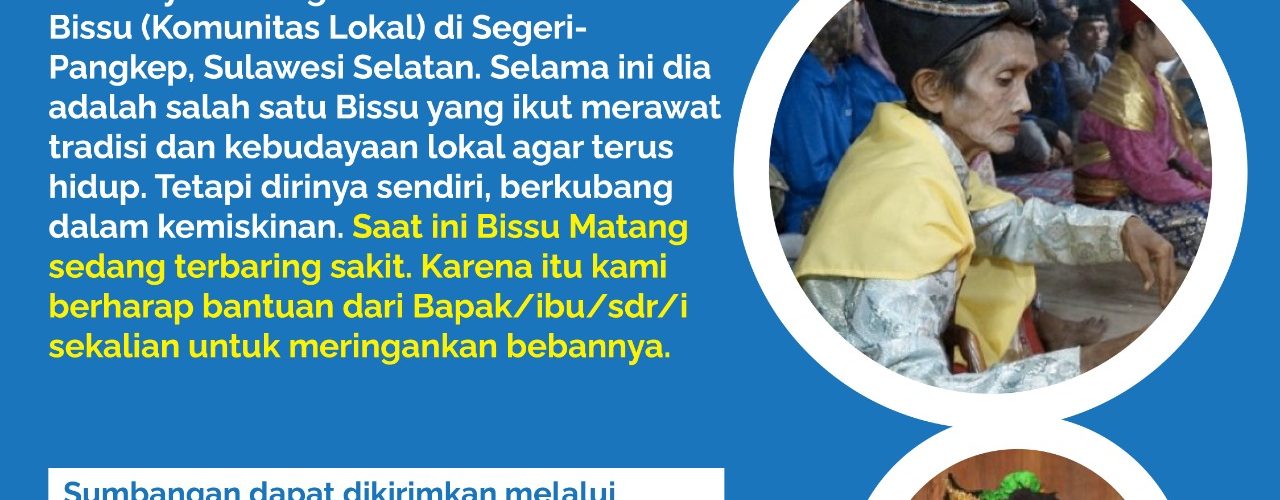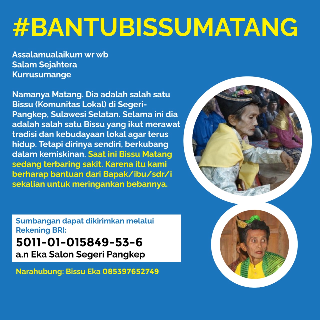 “Beliau pelestari tradisi dan kebudayaan lokal, yang mengabdikan diri mempertahankan tradisi leluhur, Beliau rela melepas semua terkait dengan aktivitas keduniawian sehingga perlu dibantu pada aspek ini, untuk itu mari kita bersama sama peduli kepada perawat budaya kita. Bissu Matang yang saat ini terbaring sakit”. Ungkap Andi Bau Erwin Gamatta