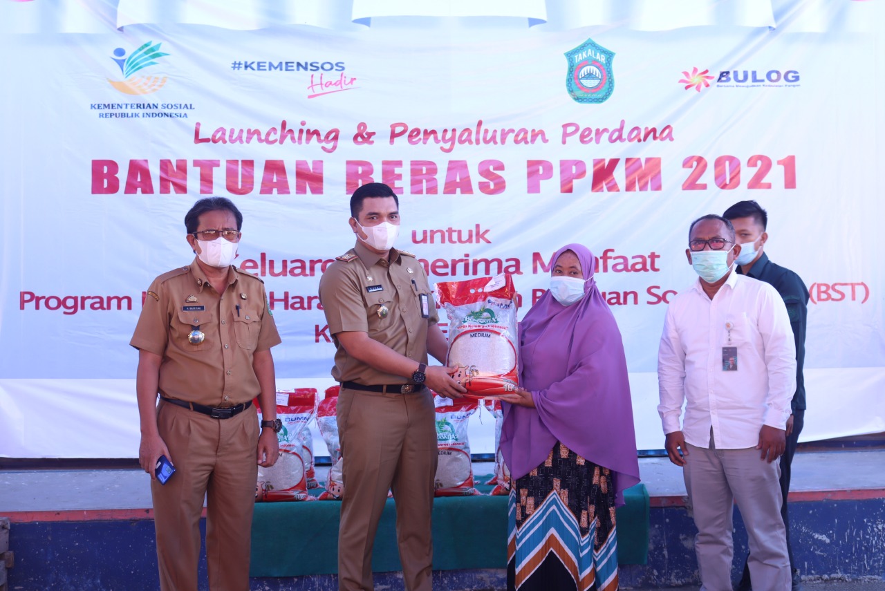 Launching sekaligus penyaluran perdana tambahan bantuan beras untuk keluarga penerima manfaat program keluarga harapan (PKH) dan Bantuan Sosial Tunai (BST) ini berlangsung di Halaman Kantor Bulog Takalar, Senin 26 Juli 2021.