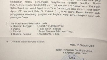 MAKASSAR.TV, SULAWESI – Laporan sengketa pilkada Luwu Timur 2020 yang dilayangkan tim hukum paslon, Ibas-Rio, terkait dugaan mutasi cabup...
